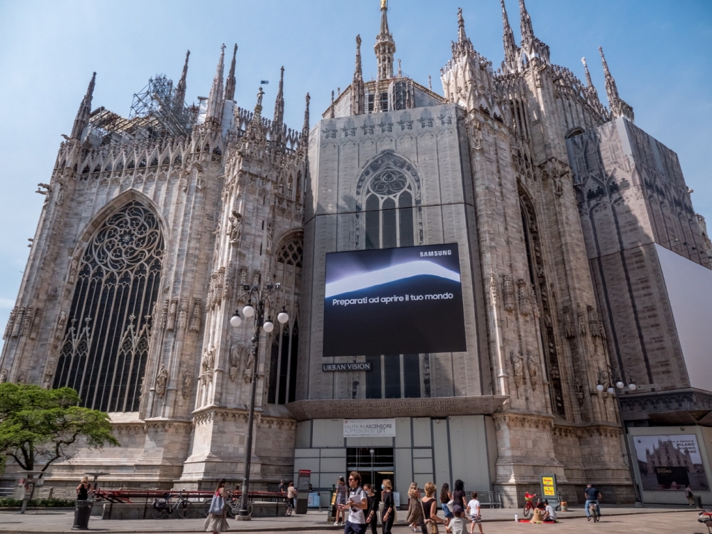 ▲ 삼성전자가 다음 달 11일 ‘삼성 갤럭시 언팩 2021’ 행사를 앞두고 전 세계 주요 랜드마크에서 옥외광고를 진행한다. 이탈리아 밀라노 두오모 광장에서 진행 중인 옥외광고