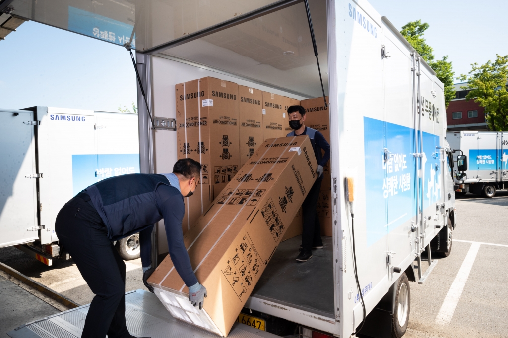 ▲ 경기도 수원시 영통구에 위치한 삼성전자로지텍 수원센터 물류창고에서 담당자들이 삼성 ‘비스포크 무풍에어컨’을 배송하기 위해 차량에 싣고 있다.