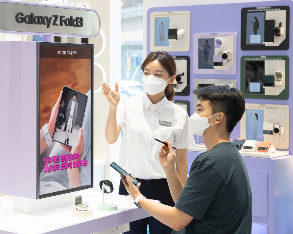▲ 삼성 디지털프라자 홍대점에서 갤럭시 팬큐레이터와 함께 ‘갤럭시 Z 폴드3’를 체험하고 있는 모습