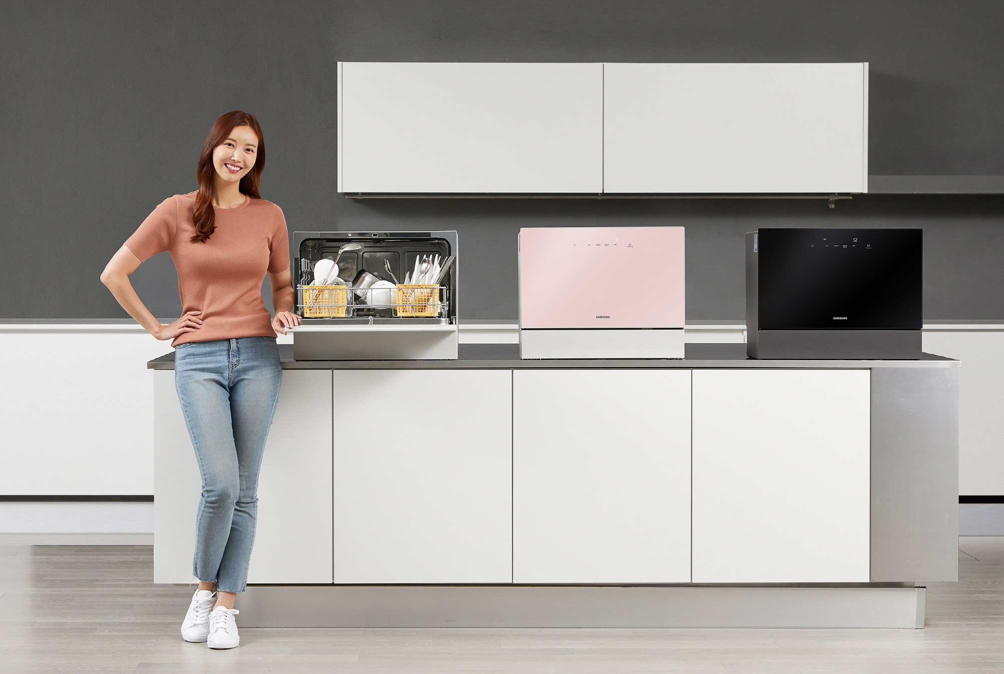 ▲ 삼성전자 모델이 삼성전자 수원사업장에서 콤팩트한 디자인에도 넉넉한 수납공간을 갖췄으며, 초강력 듀얼 세척시스템으로 세척 성능이 뛰어난 비스포크 식기세척기 카운터탑 신제품을 소개하고 있다.