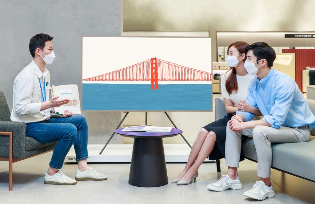 ▲ 서울 대치동에 위치한 삼성 디지털프라자 대치본점에서 삼성전자 판매 직원이 혼수가전을 마련하려는 고객에게 ‘더 프레임’을 소개하고 있다.