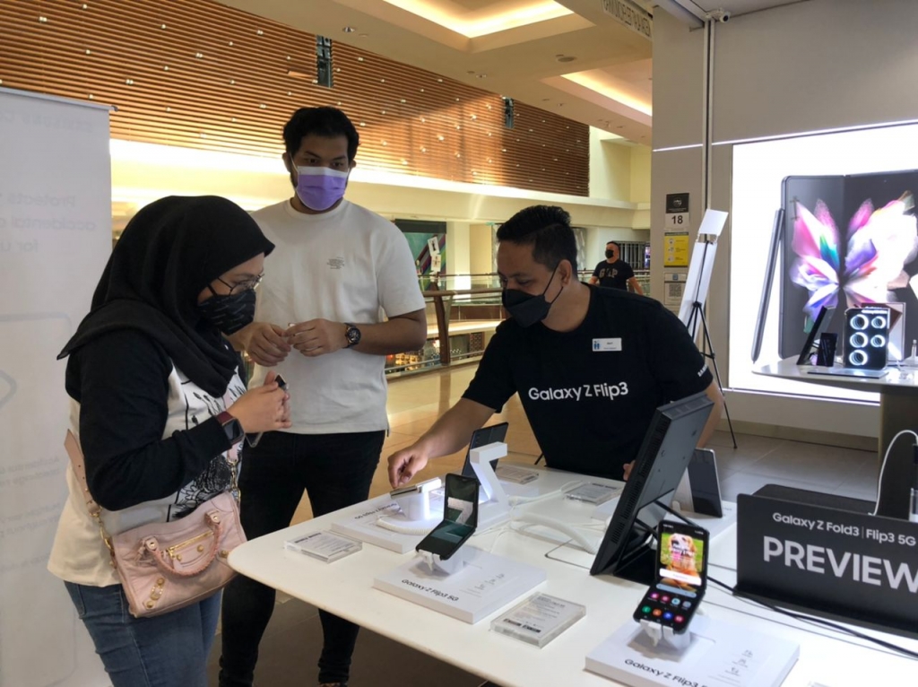 ▲ 말레이시아 쿠알라룸푸르의 가든스 몰(The Gardens Mall)에 위치한 ‘삼성 익스피리언스 스토어’에서 ‘갤럭시 Z 폴드3’·‘갤럭시 Z 플립3’를 체험하고 있는 모습