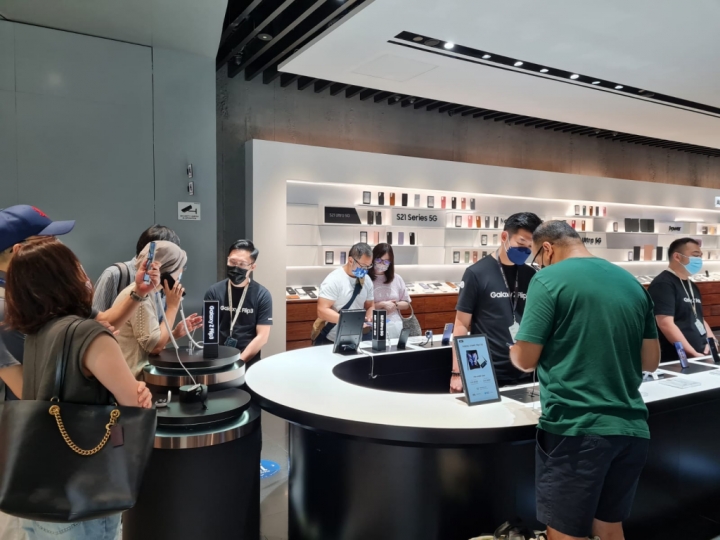 ▲ 싱가포르 상업지구 비보 시티(Vivo City)에 위치한 ‘삼성 익스프리언스 스토어’에서 ‘갤럭시 Z 폴드3’·‘갤럭시 Z 플립3’를 체험하고 있는 모습