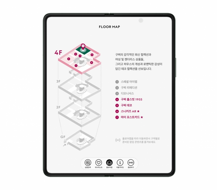 ▲ 삼성전자가 구찌와 협업한 구찌 스토어 전용 디지털 애플리케이션 ‘가옥 스마트 가이드’를 공개했다. 이 앱은 ‘구찌 가옥’ 매장에 마련된 ‘갤럭시 Z 폴드3’에 탑재되며, 고객들에게 온라인과 오프라인이 결합된 새로운 쇼핑 경험을 제공한다.