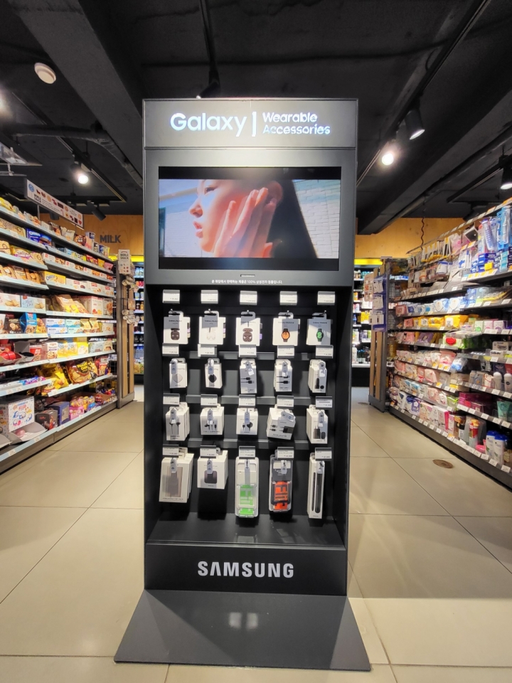 ▲ ‘갤럭시 워치4’, ‘갤럭시 버즈2’ 등 최신 갤럭시 웨어러블 기기를 이마트24에서 판매한다. 이마트24 삼청동점에 설치된 진열대 모습