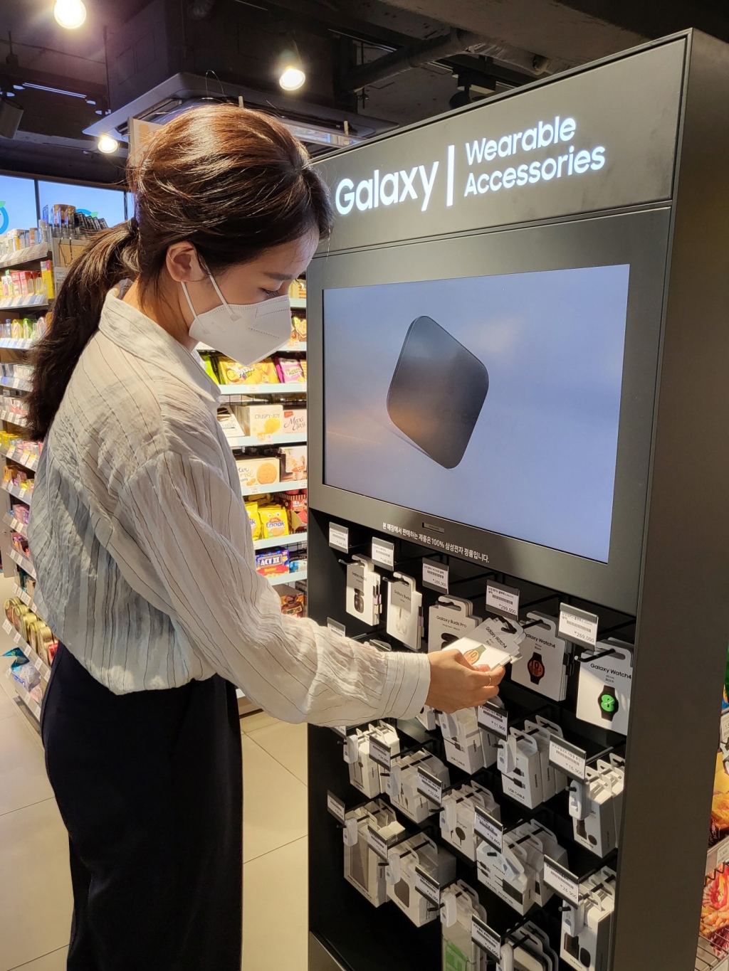 ▲ ‘갤럭시 워치4’, ‘갤럭시 버즈2’ 등 최신 갤럭시 웨어러블 기기를 이마트24에서 판매한다. 이마트24 삼청동점에 설치된 진열대 모습