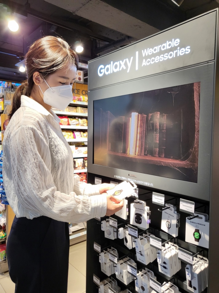 ▲ ‘갤럭시 워치4’, ‘갤럭시 버즈2’ 등 최신 갤럭시 웨어러블 기기를 이마트24에서 판매한다. 이마트24 삼청동점에 설치된 진열대 모습