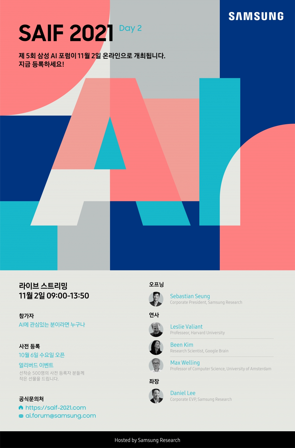 올해로 5회째를 맞는 ‘삼성 AI 포럼’은 세계적으로 저명한 인공지능(AI) 석학과 전문가들을 초청해 최신 AI 연구 성과를 공유하고 향후 연구 방향을 모색하는 기술 교류의 장이다.