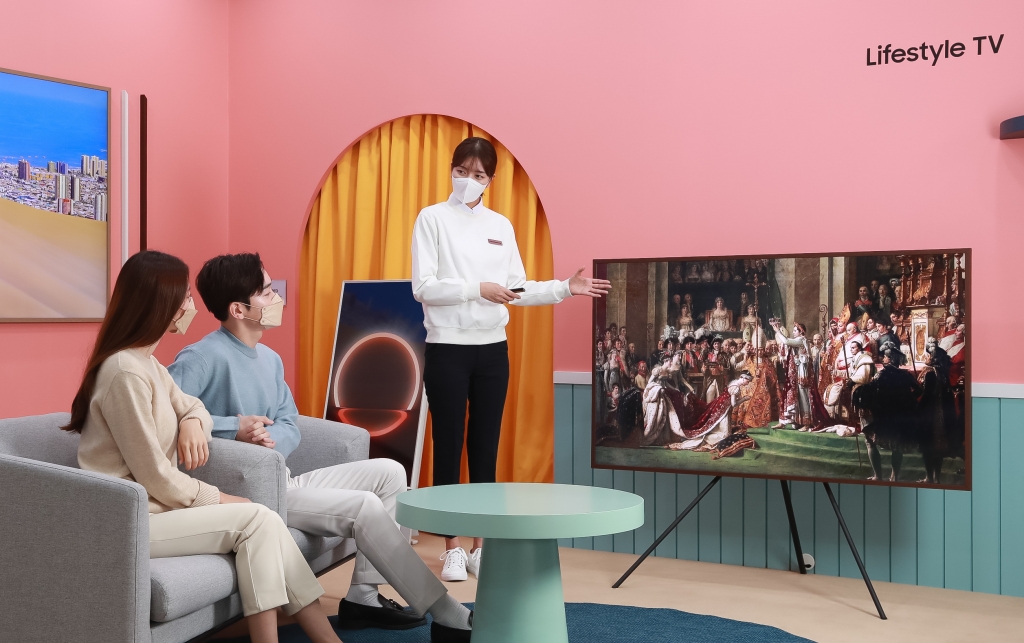 ▲ 서울 코엑스에서 열린 ‘KES 2021’ 삼성전자 부스에서 관람객들이 ‘The Frame’의 아트모드로 루브르 대표 작품을 감상하고 있다.