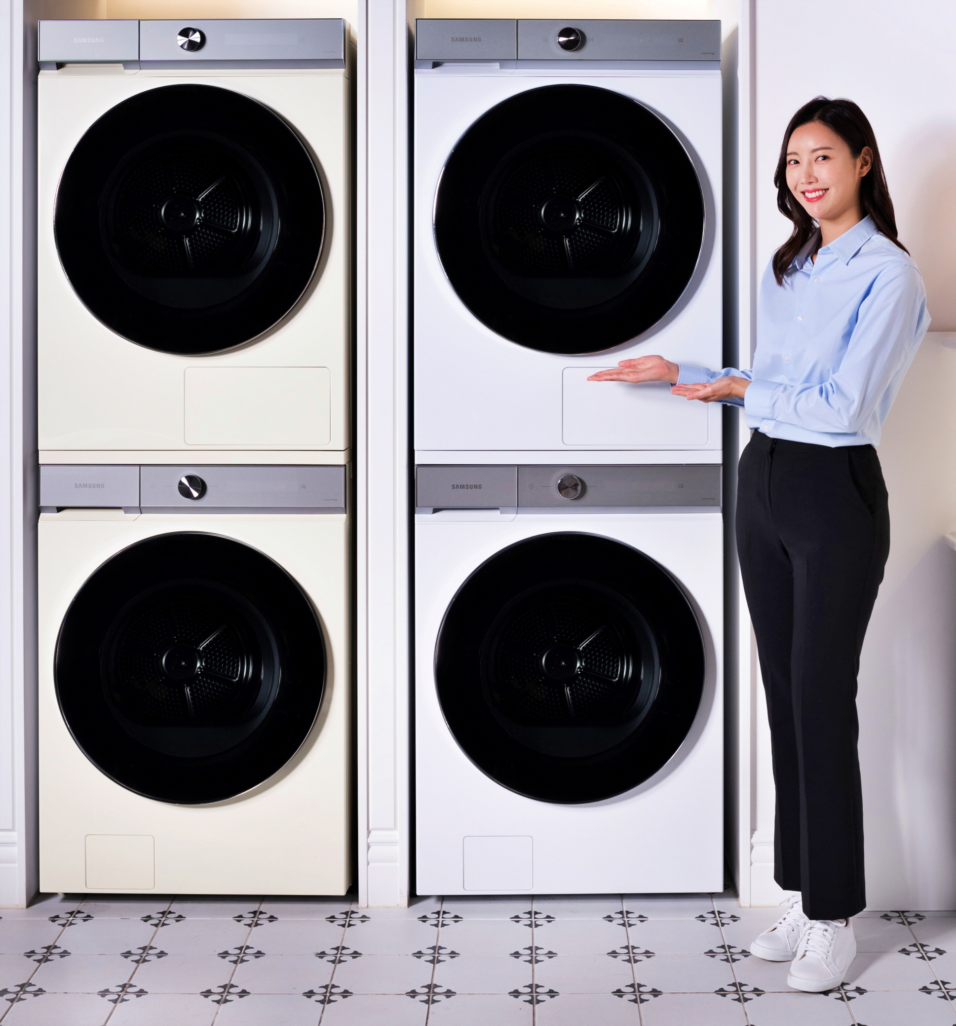 ▲ 삼성전자 모델이 삼성 디지털프라자 강남본점에서 국내 최대 20kg 용량 건조기 ‘비스포크 그랑데 AI’ 신제품을 소개하고 있다. 삼성 건조기 전용 상단 설치 키트로 국내 최대 24kg 용량 세탁기와 함께 깔끔하게 직렬 설치된 모습(하단 세탁기·상단 건조기)