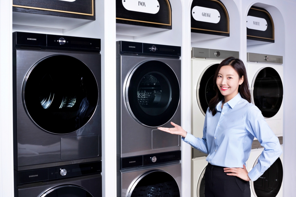 ▲ 삼성전자 모델이 삼성 디지털프라자 강남본점에서 국내 최대 20kg 용량 건조기 ‘비스포크 그랑데 AI’ 신제품을 소개하고 있다. 삼성 건조기 전용 상단 설치 키트로 국내 최대 24kg 용량 세탁기와 함께 깔끔하게 직렬 설치된 모습(하단 세탁기·상단 건조기)
