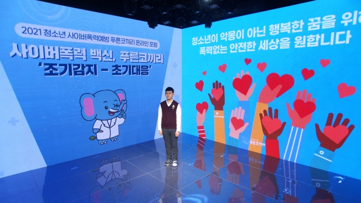 ▲ 11월 3일 푸른나무재단 유튜브에서 개최된 ‘2021 청소년 사이버폭력 예방 푸른코끼리 온라인 포럼’에서 한 고등학생이 사이버폭력의 심각성을 주제로 강연을 하고 있다.