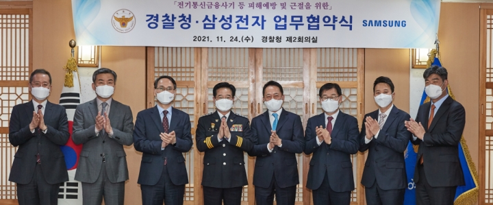경찰청과 삼성전자는 24일 서울 서대문구 경찰청에서 김창룡 경찰청장과 삼성전자 경영지원실장 최윤호 사장 등이 참석한 가운데 ‘전기통신 금융사기 근절을 위한 업무협약(MOU)’을 체결했다.