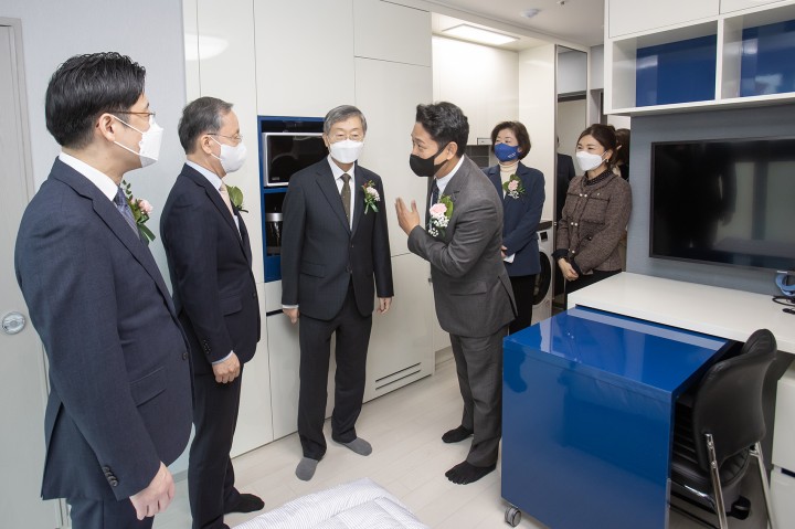 ▲ 29일 경기도 화성시에 개소한 ‘삼성 희망디딤돌’ 경기센터 시설을 관계자들이 둘러보고 있다. 왼쪽부터 오병권 경기도지사 권한대행, 박학규 삼성전자 DS부문 경영지원실 사장, 조흥식 사랑의열매 회장, 진석범 경기복지재단 대표이사