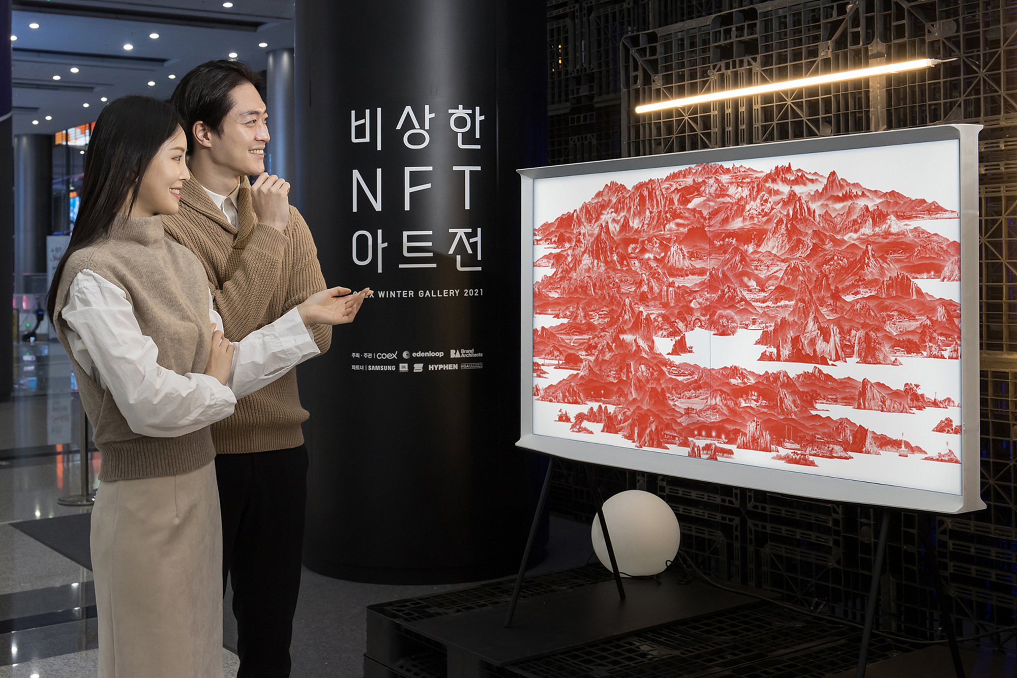 ▲ 삼성전자 모델이 코엑스에서 열리는 ‘코엑스 윈터 NFT 갤러리 2021’에서 라이프스타일 TV를 통해 전시되는 디지털 작품들을 소개하고 있다.