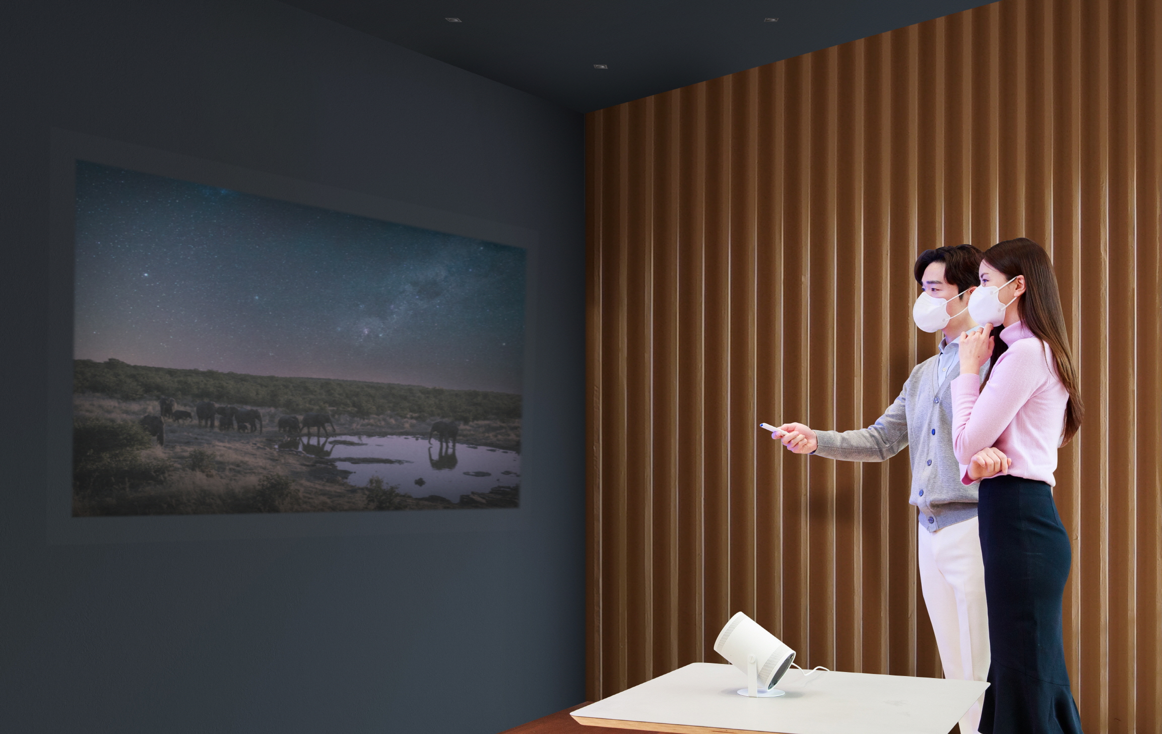 더 프리스타일은 180도까지 자유자재로 회전해 벽·천장·바닥 등 공간에 구애받지 않고 최대 100형(대각선 254cm) 크기의 화면을 구현할 수 있다.