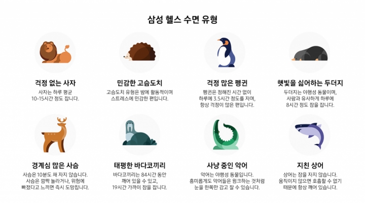 ▲ 삼성 ‘갤럭시 워치4’ 시리즈의 탁월한 수면 측정 기능 관련 참조 이미지. 이번 업데이트를 통해 수면 패턴을 8가지 동물 유형으로 보여준다.