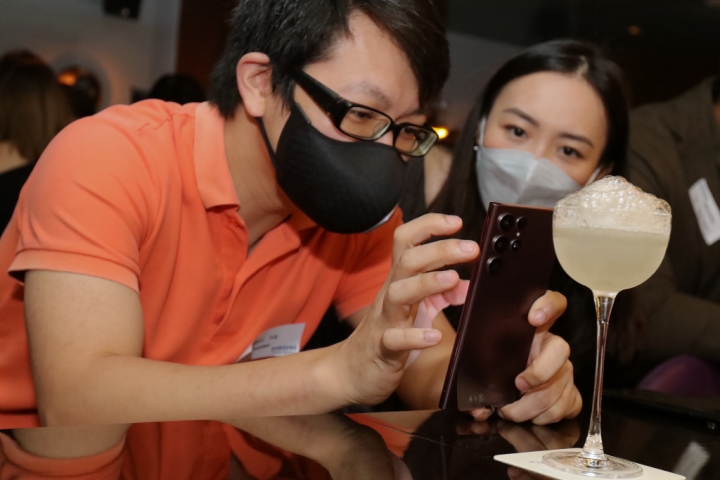 ▲싱가포르 아마라(Amara) 호텔에서 진행된 미디어 행사에서 현지 미디어들이 ‘갤럭시 S22’ 시리즈를 체험하고 있는 모습
