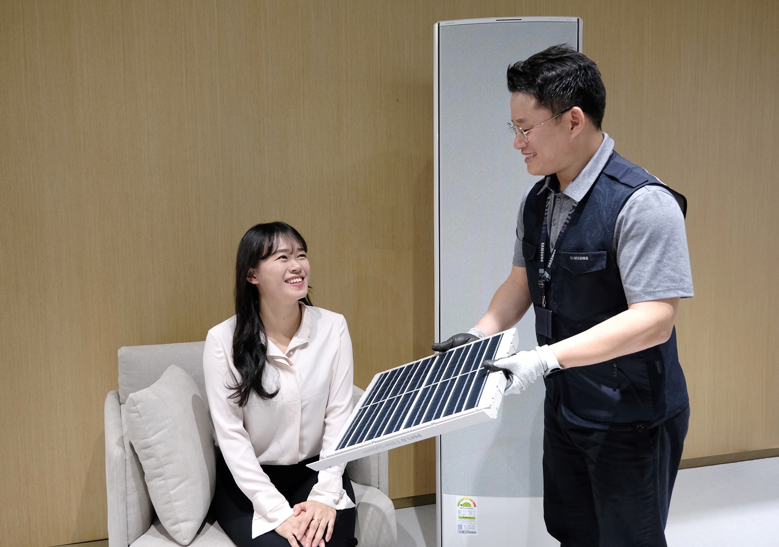 ▲삼성전자서비스 엔지니어가 에어컨 필터 관리 방법을 설명하는 모습