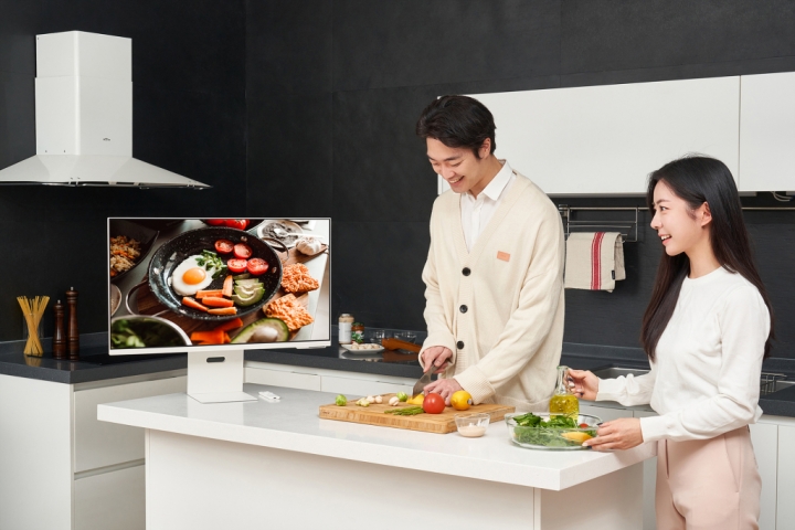 ▲삼성전자 모델이 집안 내 다양한 공간에서 활용 가능한 스마트 모니터 M8을 소개하고 있다.
