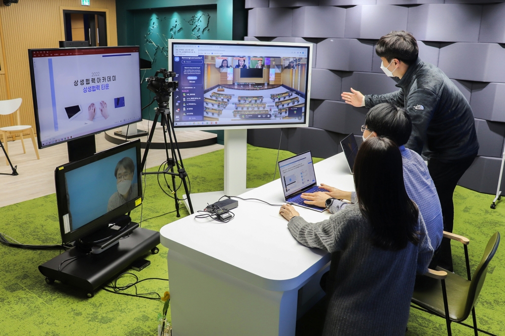 ▲14일 경기도 수원시 삼성전자 ‘상생협력아카데미’에서 ‘2022 협력회사 신입사원 입문교육’ 1차 과정이 메타버스를 활용한 실시간 비대면 교육으로 실시되고 있다.