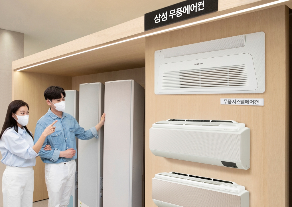 ▲삼성전자 모델이 서울 대치동에 위치한 삼성 디지털프라자 삼성대치본점에서 ‘무풍 에어디자인 페스티벌’ 행사를 소개하고 있다.