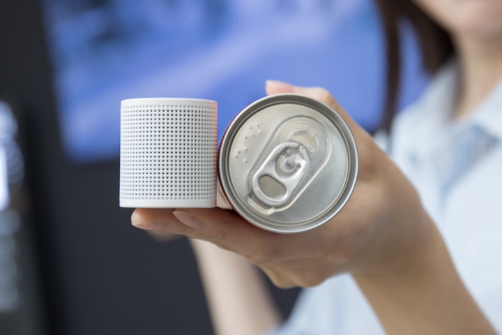 ▲삼성전자 모델이 서울 논현동에 위치한 삼성 디지털프라자 강남본점에서 슈퍼 슬림 사운드바 HW-S800B의 슬림한 디자인을 갤럭시 워치, 음료캔 등 다양한 사물과 비교해 소개하고 있다.