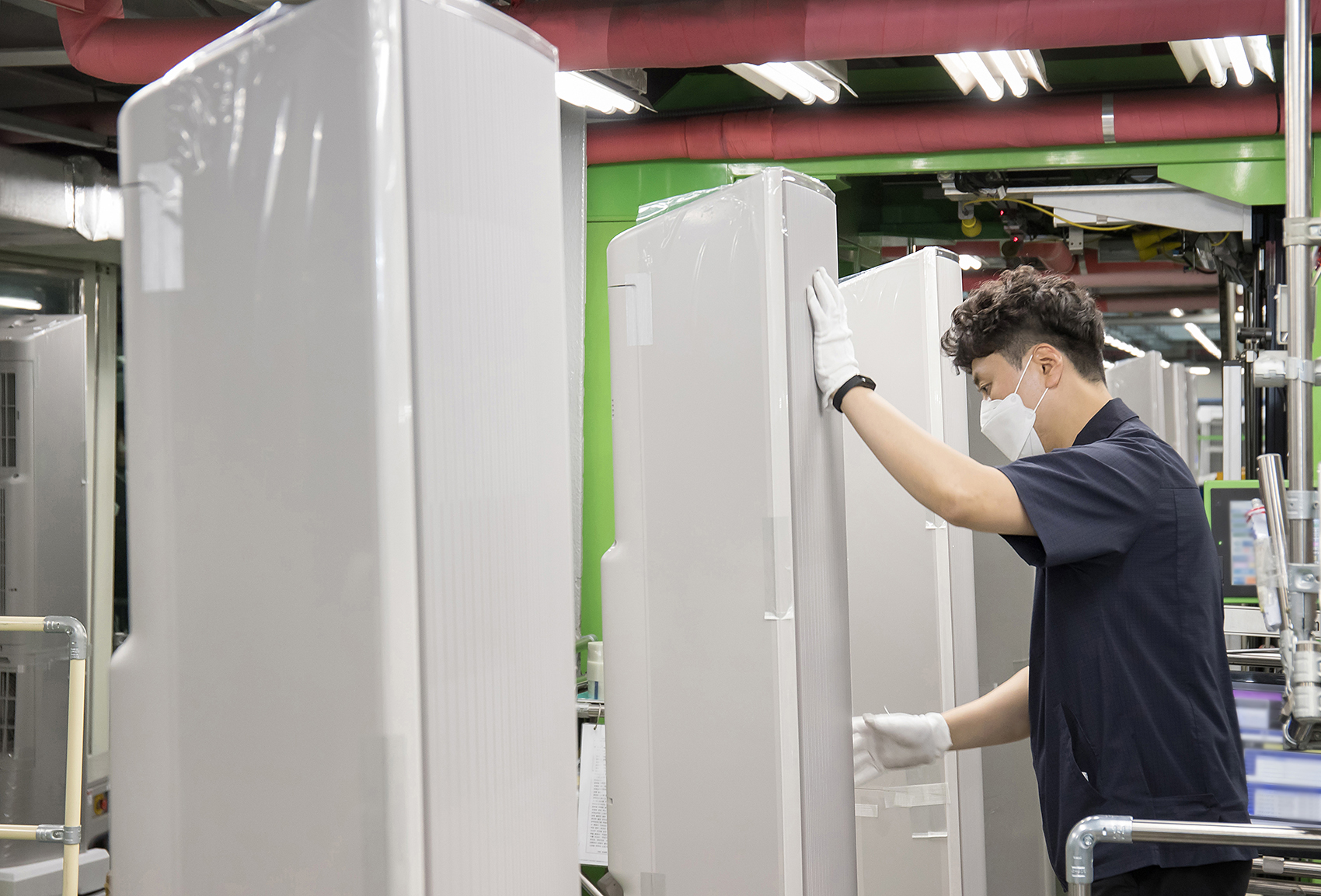 ▲삼성전자가 2022년형 무풍에어컨 인기에 힘입어 광주사업장에 위치한 에어컨 생산라인을 2월부터 풀가동하고 있다. 광주광역시 광산구 하남산단 6번로에 위치한 삼성전자 광주사업장에서 직원들이 ‘비스포크 무풍에어컨 갤러리’를 생산하는 모습.