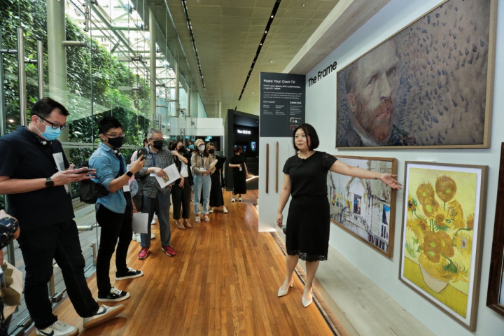 ▲ 삼성전자가 13일 싱가포르 국립미술관에서 2022년 TV 신제품 출시 행사를 진행했다. 행사 참석자들이 라이프스타일 TV ‘더 프레임’을 체험하고 있는 모습. 삼성전자는 현지 프리미엄 인테리어·가구 브랜드인 커뮨(Commune)과 협업해 맞춤형 베젤 4종도 선보였다.