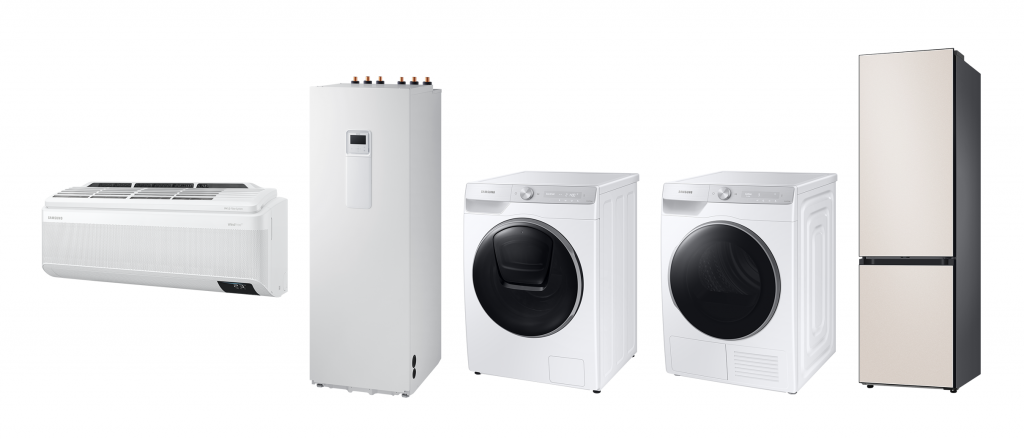 ▲이탈리아 소비자 만족도 조사에서 좋은 평가를 받은 삼성전자 에어컨과 대형가전. 왼쪽부터 에어컨, 히트펌프 보일러, 세탁기, 건조기, 냉장고.
