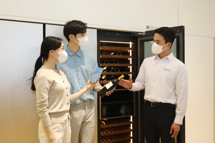 ▲ 서울 코엑스에서 열린 ‘월드IT쇼 2022’ 삼성전자관에 마련된 팀삼성 홈의 프리미엄 키친에서 관람객이 ‘비스포크 와인냉장고 인피니트 라인’과 함께 와인 라벨을 스캔하면 와인 정보가 자동 입력되고 보관 리스트에 추가되어 편리한 관리가 가능한 스마트싱스(SmartThings)의 ‘소믈리에 앳 홈’ 기능을 체험하고 있다.