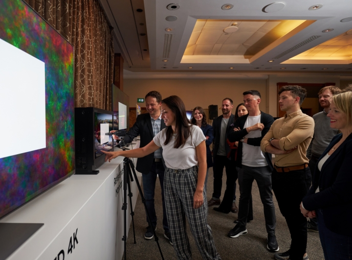 ▲5월 11일(현지시간) 영국 런던 로얄가든 호텔에서 개최된 삼성전자 유럽 테크세미나에서 참석자들이 삼성전자의 2022년형 신제품 Neo QLED 8K를 살펴보고 있다.