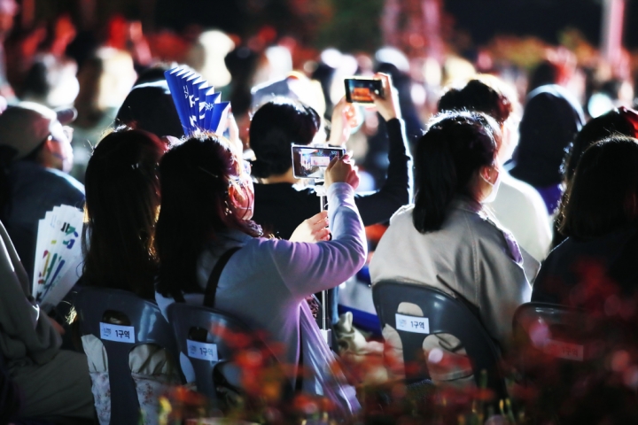 ▲참가자들이 에버랜드 퍼레이드팀과 댄스팀의 합작 퍼포먼스인 나이토그래피 스테이지를 갤럭시 S22의 나이토그래피 기능으로 촬영해보고 있다.