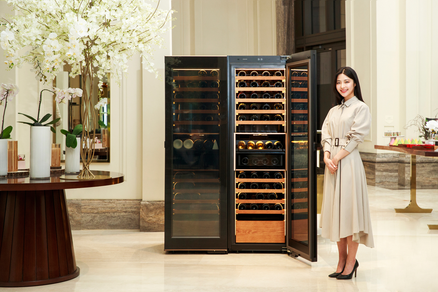 ▲삼성전자 모델이 인천 운서동에 위치한 파라다이스시티 호텔에서 ‘비스포크 와인냉장고 인피니트 라인’과 ‘비스포크 큐브 에어’ 체험 공간을 소개하고 있다.