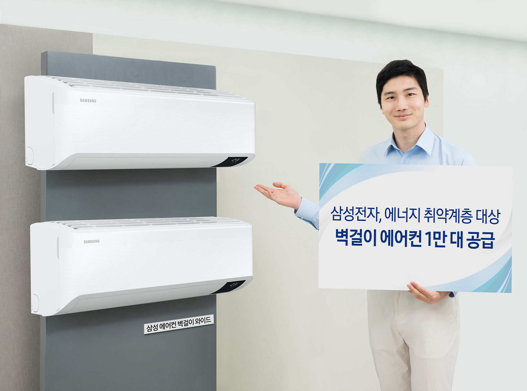 ▲삼성전자가 한국에너지재단이 주관하는 ‘2022년 저소득층 에너지효율개선사업’ 냉방기기 보급 사업자로 선정되어, 에너지 취약계층 대상 벽걸이 에어컨 1만대를 공급한다. 삼성전자 모델이 공급 제품인 삼성 에어컨 ‘벽걸이 와이드’를 소개하고 있는 모습