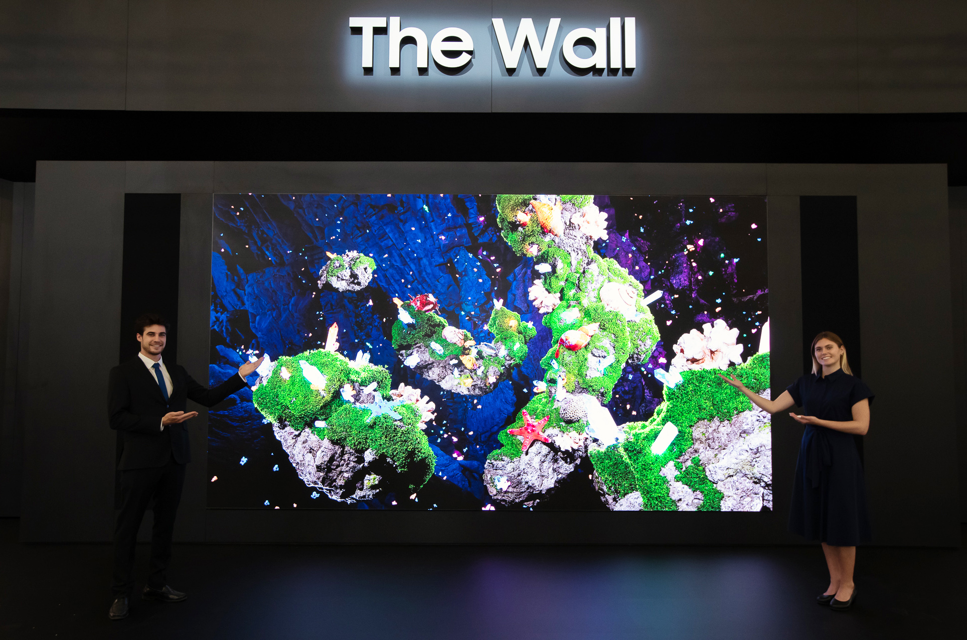 ▲ISE 2022가 개최되는 스페인 바르셀로나의 피라 그라 비아 전시장에서 삼성전자 모델이 상업용 디스플레이 신제품 2022년형 마이크로 LED ‘더 월’을 선보이고 있다.