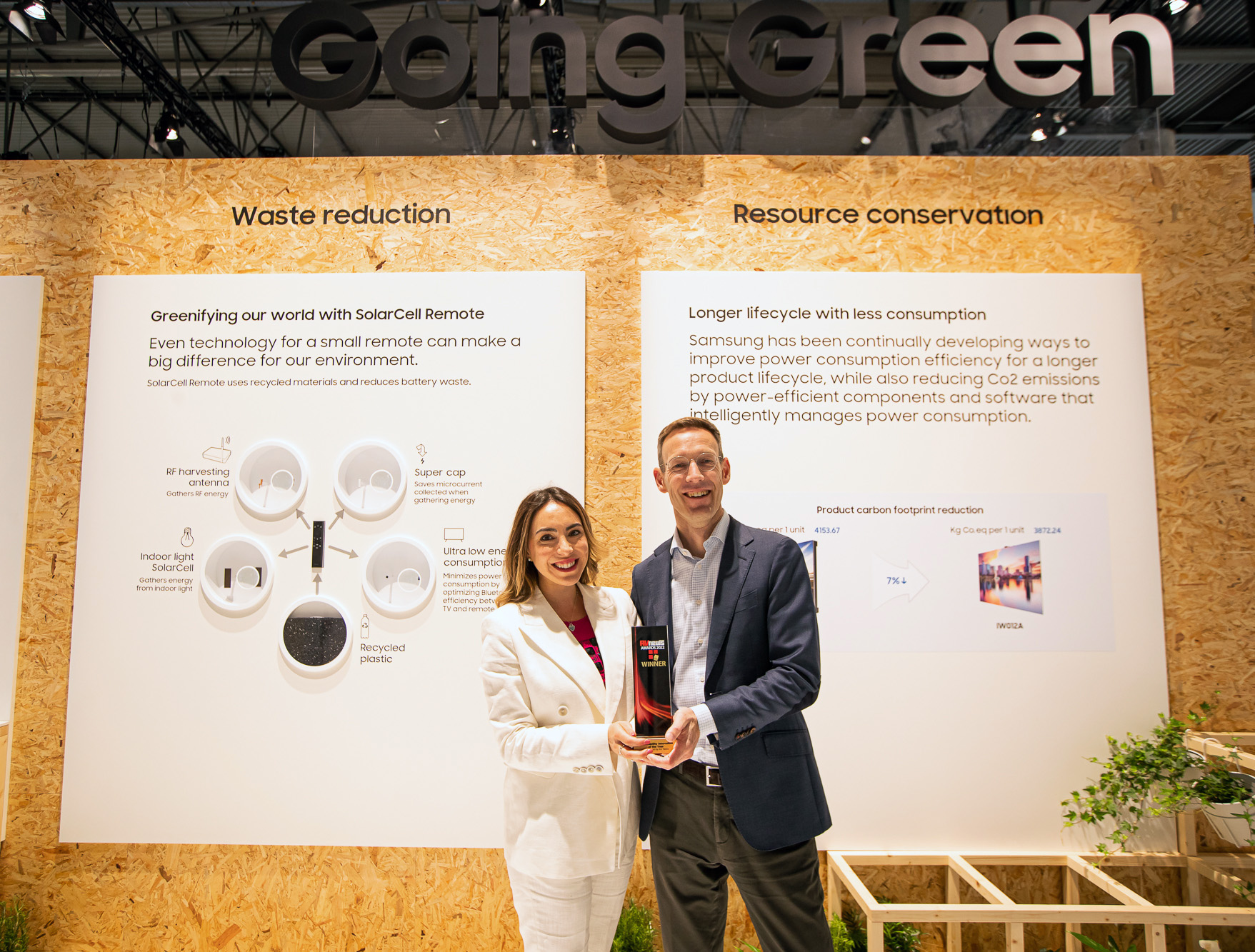 ▲ 삼성전자는 ISE 2022 기간 유럽 AV전문 매체 AV News가 수여하는 ‘올해의 지속 가능 혁신(Sustainability Innovation) 기업’으로 선정됐다. 스페인 바르셀로나 피라 그라 비아 전시장 내 삼성부스에서 삼성전자 스페인 법인 마케팅 담당 올가 트라페로(Olga Trapero)(사진 왼쪽)와 삼성전자 유럽 디스플레이 오피스 마케팅 담당 페페 디크스트라(Pepe Dijkstra)가 수상을 기념하고 있다.