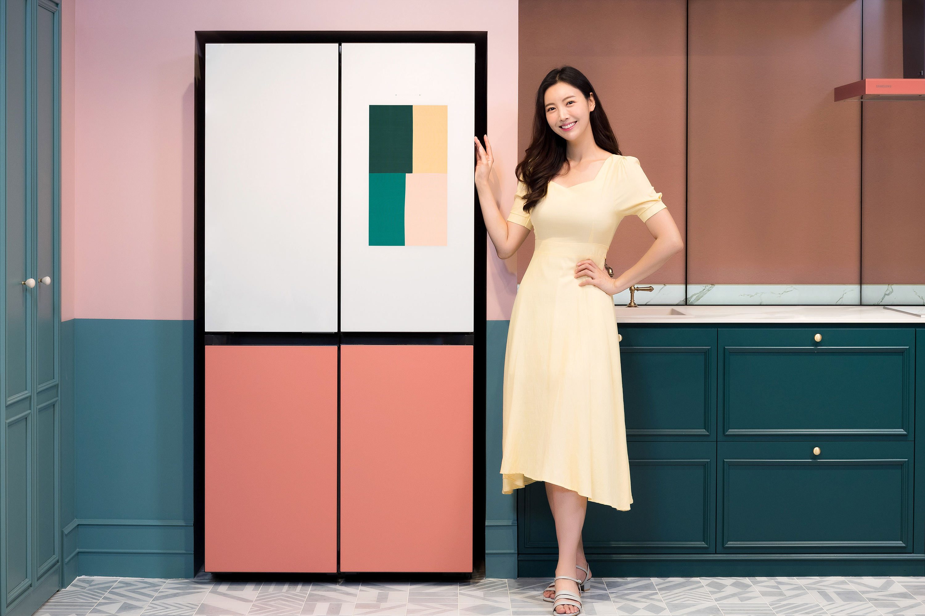 ▲삼성전자 모델이 서울 논현동에 위치한 삼성 디지털프라자 강남본점에서 패밀리허브 냉장고 전용 애플리케이션 ‘비스포크 아뜰리에’를 통해 에단 쿡 작가의 작품 ‘무제’를 소개하고 있다.