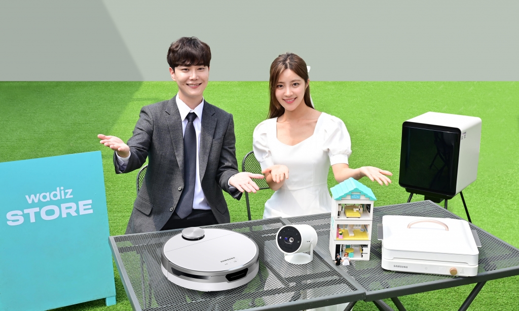 ▲삼성전자 모델이 서울 성수동에 위치한 공간 와디즈에서 ‘삼성 신혼가전 굿즈’를 선보이고 있다.
