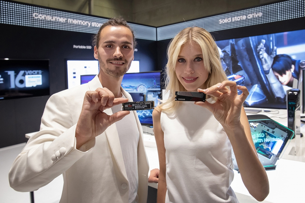 ▲ IFA 2022가 열리는 메세 베를린(Messe Berlin)에 위치한 시티 큐브 베를린(City Cube Berlin) ‘삼성 타운’에서 삼성전자 모델이 DS 전시존의 고성능 SSD 990pro를 선보이고 있다.