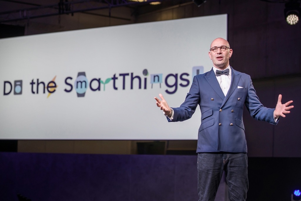 ▲삼성전자 유럽총괄 마케팅 책임자 벤자민 브라운(Benjamin Braun) 상무가 독일 베를린 ‘메세 베를린(Messe Berlin)’에서 열리는 유럽 최대 가전전시회 ‘IFA 2022’를 하루 앞둔 1일 개최된 삼성 프레스 컨퍼런스에서 오프닝 연설을 하고 있다.