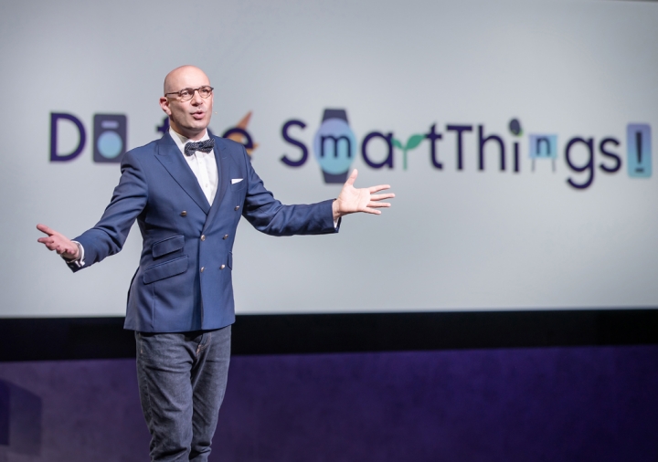 ▲삼성전자 유럽총괄 마케팅 책임자 벤자민 브라운(Benjamin Braun) 상무가 독일 베를린 ‘메세 베를린(Messe Berlin)’에서 열리는 유럽 최대 가전전시회 ‘IFA 2022’를 하루 앞둔 1일 개최된 삼성 프레스 컨퍼런스에서 오프닝 연설을 하고 있다.