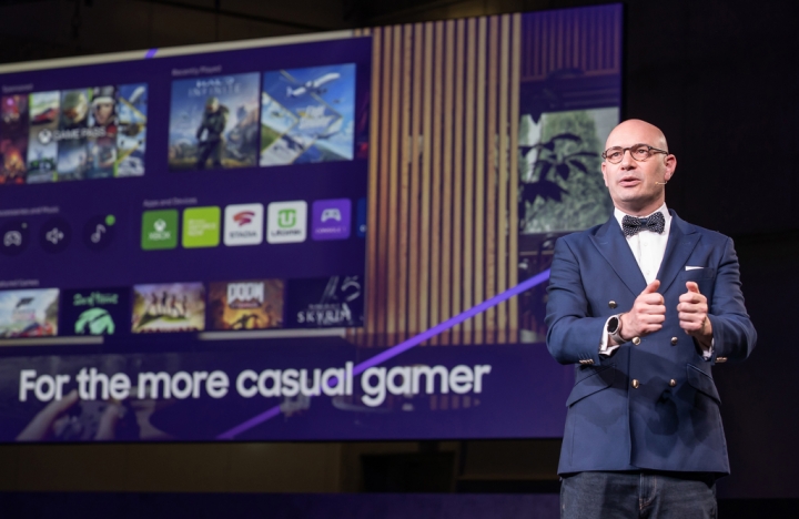 ▲삼성전자 유럽총괄 마케팅 책임자 벤자민 브라운(Benjamin Braun) 상무가 독일 베를린 ‘메세 베를린(Messe Berlin)’에서 열리는 유럽 최대 가전전시회 ‘IFA 2022’를 하루 앞둔 1일 개최된 삼성 프레스 컨퍼런스에서 오프닝 연설을 하고 있다.