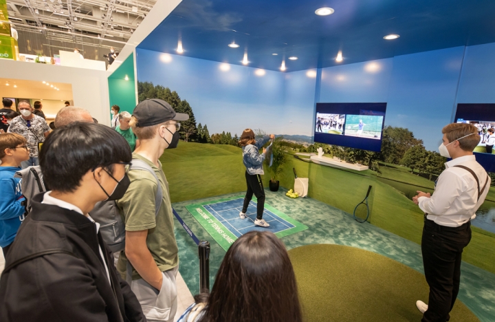 ▲ 스마트싱스 플레이그라운드 피트니스 존. IFA 2022가 열리고 있는 메세 베를린(Messe Berlin)의 시티 큐브 베를린(City Cube Berlin) ‘삼성 타운’에서 관람객들이 삼성전자의 다양한 제품과 기술을 체험하고 있다.