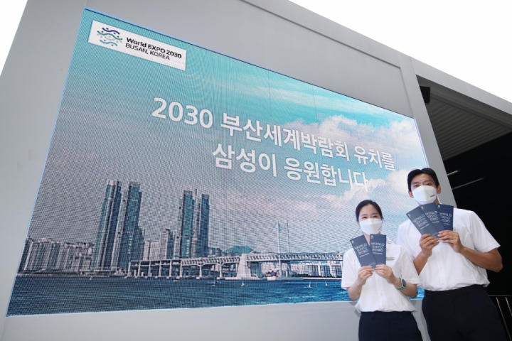 ▲ 홍보관 외부 LED 디스플레이에 2030 부산세계박람회 유치를 응원하는 영상이 상영되는 모습