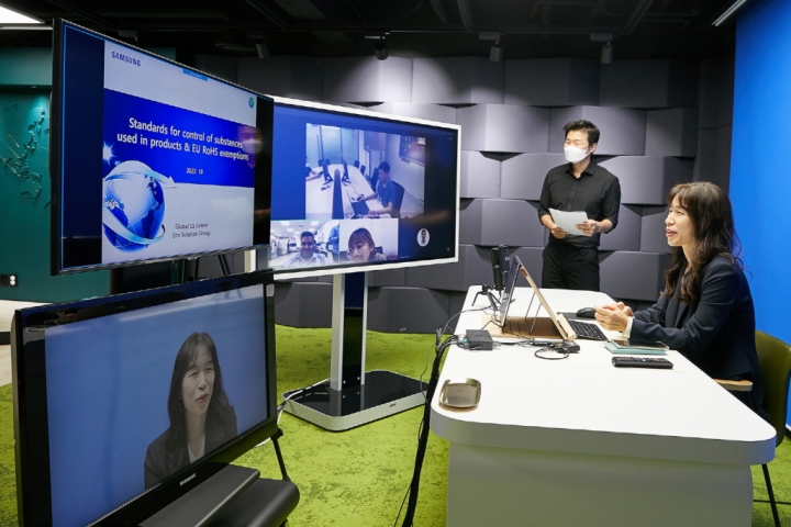 ▲삼성전자가 11일부터 14일까지 4일간 해외 840여개 협력사를 대상으로 제품 화학물질 관리 방법 교육을 실시했다. 12일 경기도 수원시 삼성전자 ‘상생협력아카데미’에서 삼성전자 직원들이 해외 협력사 대상으로 실시간 화상교육을 진행하는 모습.