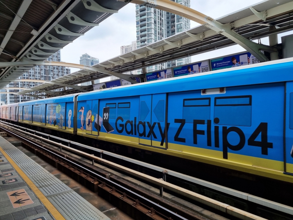 삼성전자의 갤럭시 Z 플립4가 태국 방콕의 스카이 트레인(Sky Train, 지상철)과 함께 시내 중심가를 달린다.