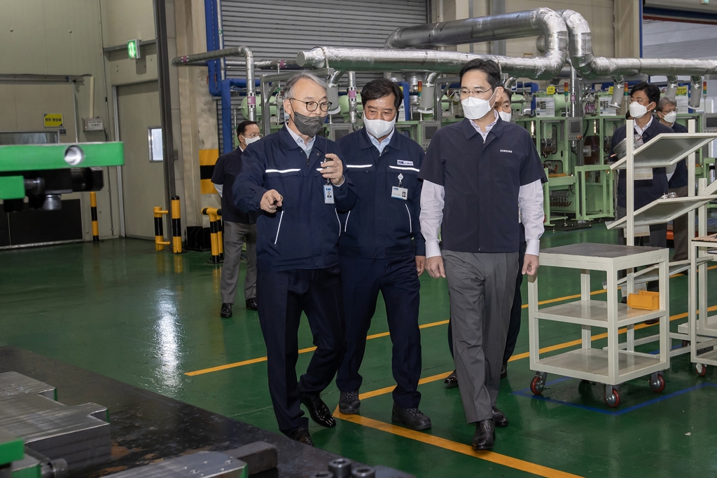 ▲10월 28일 광주광역시에 위치한 삼성전자 협력회사 ‘디케이’에서 이재용 삼성전자 회장과 김보곤 디케이 대표(왼쪽에서 두번째)가 생산 라인을 둘러보고 있다.
