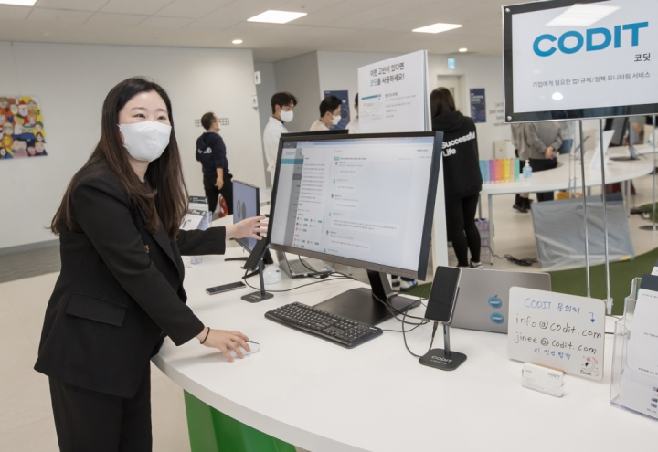 ▲C랩 아웃사이드 4기 스타트업 중 기업에게 필요한 법/규제/정책 모니터링 서비스 업체 ‘코딧’이 사업을 소개하는 모습