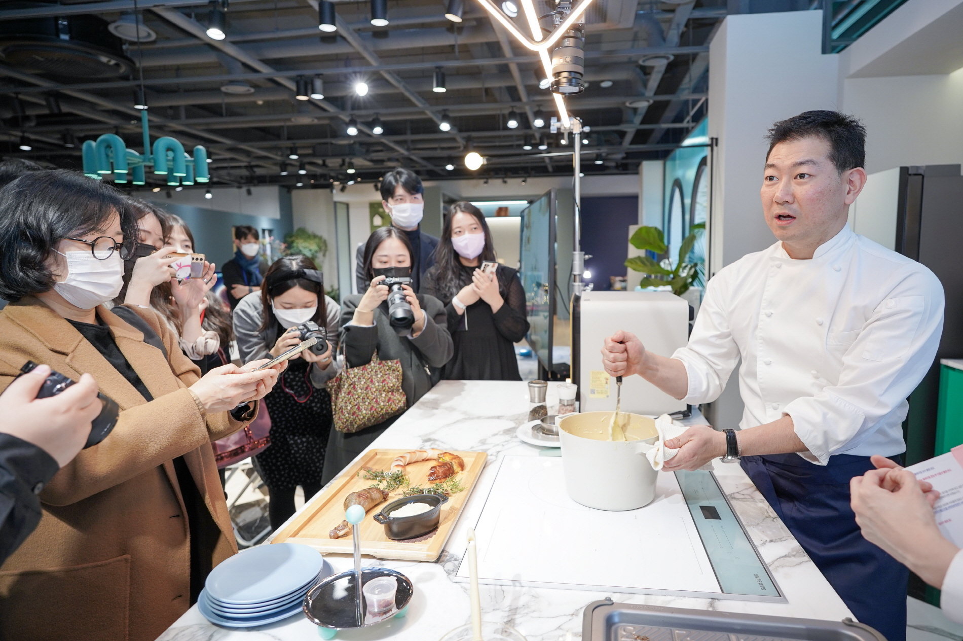 ▲ 지난 11일 삼성 디지털프라자 강남본점에서 진행된 ‘큐커 미식 페스티벌’에서 삼성 ‘클럽드셰프’ 소속 임기학 셰프가 ‘비스포크 큐커’를 활용해 연말 홈파티를 위한 쿠킹 클래스를 진행하고 있는 모습